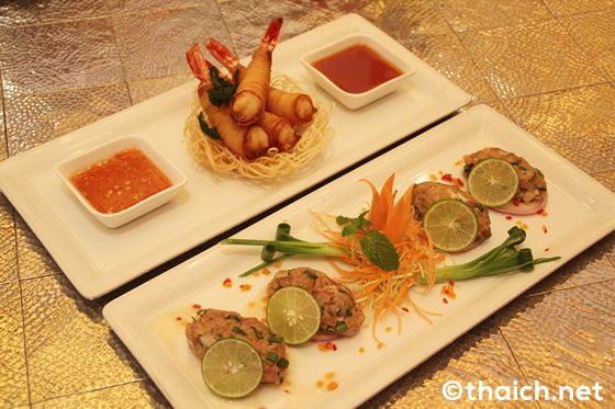 次もアペタイザーからグーン・サローン(Goong Sarong 460B)。海老を春巻きの皮で包み、それを麺で巻いたものです。日本のエビ天に似ていますが、よりサクッとした感触がたまりません。