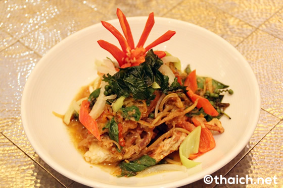 揚げたてのソフトシェル・クラブと野菜の餡を絡めたプー・ニム・トード・ラート・ソース・ホラパ(Poo Nim Thord Lard Sauce Horapha 550B)は、和風中華のような味付けで日本人の舌に合います。