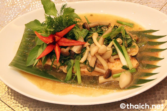 タイの人も大好きなサーモンを使ったモック・プラー・サーモン(Mok Pla Salmon 650B)は、3種のキノコや香草など野菜たっぷりでヘルシーその物。