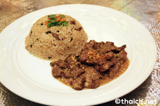 〆はビーフ・テンダーロインを使ったカオ・グラティアム・ヌア・サン(Khao Gratiam Nua San 390B)。よく見てください、柔らかい牛肉がライスにも入っているんです!肉汁がお米にコラボして最高です。