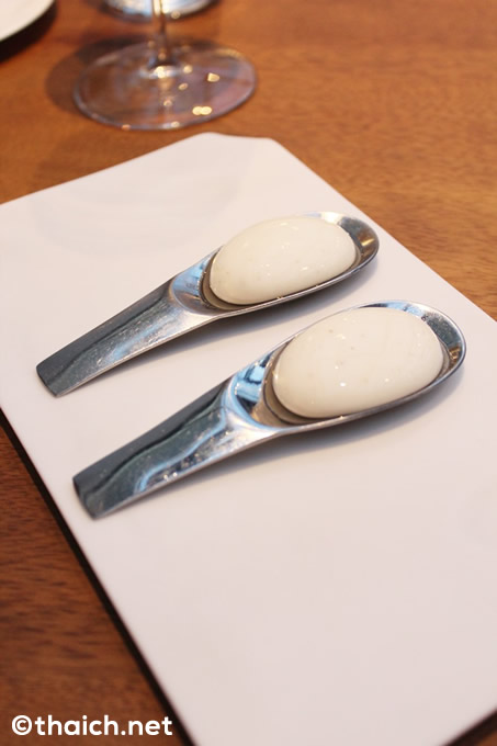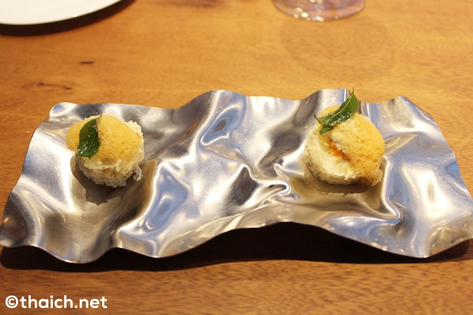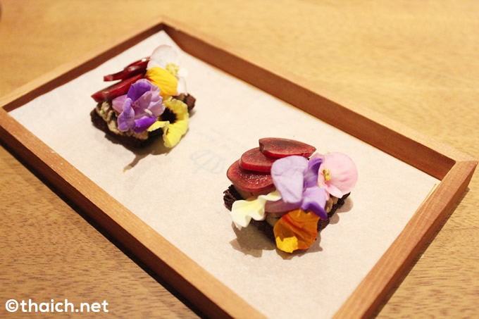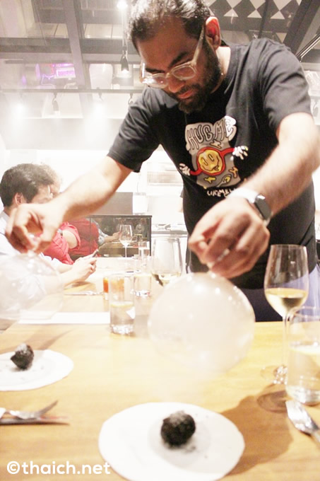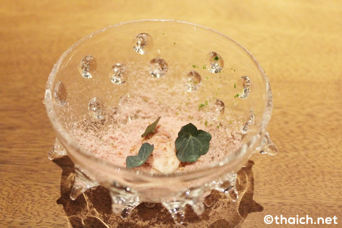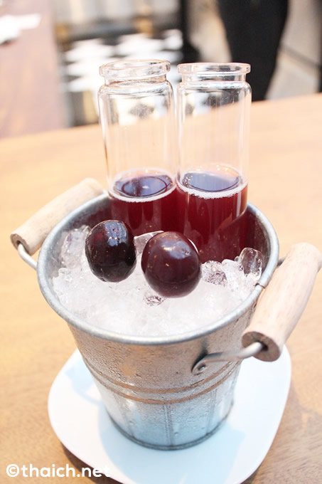 料理はコースのみ(4000バーツ+サービス&税)。最初にBitesと呼ばれる前菜が供されます。まずはPickled Cherry Soda、容器も面白いですね!