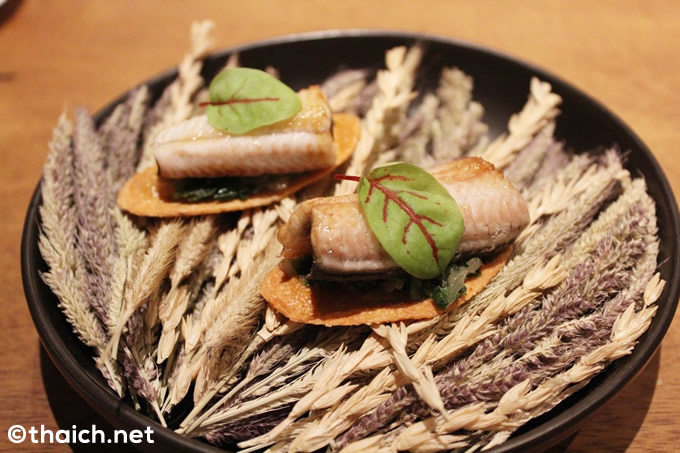 Khakra Eel Sandwichはウナギを使っています。ガガンさんは大の日本好きだそうで、和食の素材や盛り付けをあちらこちらに感じます。