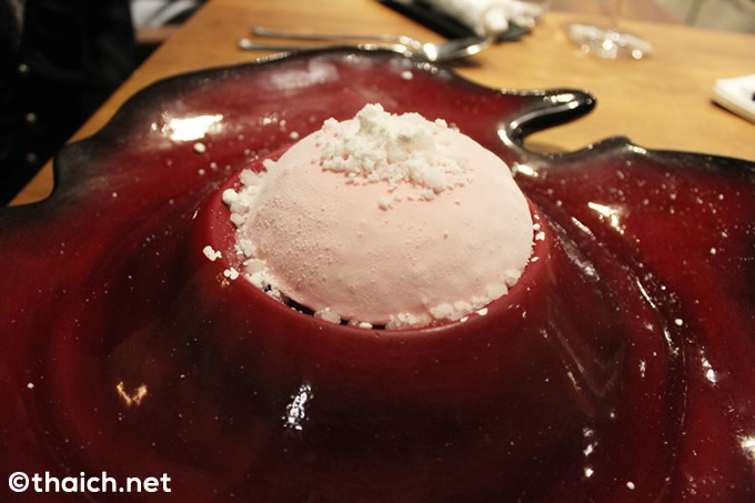 メインも終わり、今度はデザートタイム。Peach Snowballは殻を割って中のアイスと一緒に。