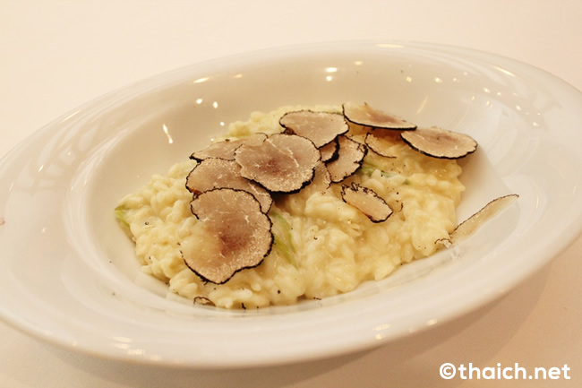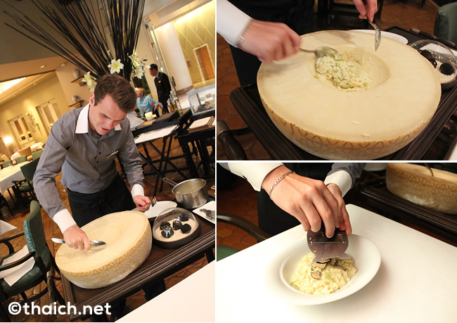 今度は大きなチーズが運ばれてきました!イケメンくんがその場でチーズをからめ、トリュフをふんだんに盛ったリゾット(asparagus carnaroli risotto, summer black truffle B750)。これは贅沢ですね~。