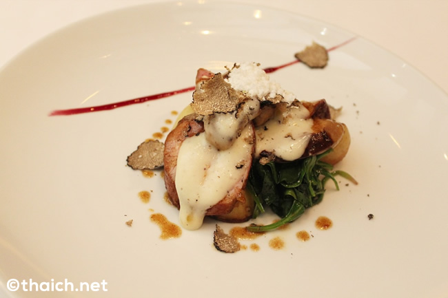 いよいよメインです!子牛肉のステーキ(sous vide milk fed veal tenderloin, foie gras, potatoes, baby spinach, black truffle B1,650)の上にはフォラグラがどか~んと載っています。盛り付けも奇麗ですね~。