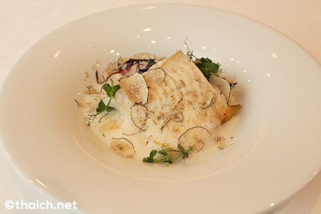 続いては魚。ターボット(カレイの一種)のロースト(pan roasted turbot, sautéed vegetables, wild mushrooms, black truffle B1,250)。こちらもトリュフがたっぷり使われています!
