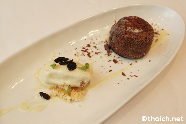 もうお腹一杯ですが、デザート抜きでは終われません!チョコケーキとラムレーズンアイス(pan roasted turbot, sautéed vegetables, wild mushrooms, black truffle B320)が最後にやって来ました。濃厚なチョコがまた良いんです!