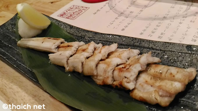 最初に出てきたのが「黄金あなご 白焼き」。熱々のうちに醤油とワサビでいただきます。