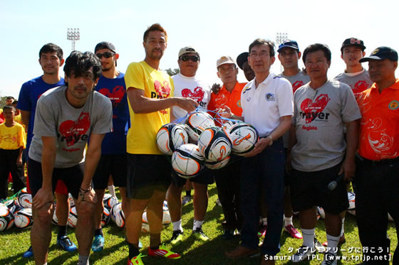 2月23日(土)、TPLに所属するOSOTAPA M150 のSARABURIスタジアムで“チャリティーサッカークリニック”が開催された。元々2011年のタイ大洪水時にこのクラブに所属する片野寛理選手と「東日本大震災&大津波」時に真っ先に支援の手を挙げてくれたタイの人達に恩返しがしたいとRegistaの義援“Prayer” T-shirtの販売協力という形で携わったもの。とはいえ俺は選手を引退している立場、現役選手達と触れ合う方が子ども達にとって良かろうと思ったのだけれど、Rajprachaの選手時代に自分に協力してくれた方々が義援協力をしてくれた事もあり、参加する義務があると参加する事にした。