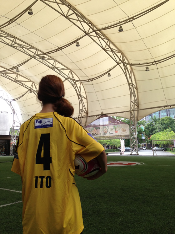 俺の家内も”infinito elf”のメンバーである。彼女はゴール前に”ここぞ”というタイミングで入ってくる…かなり言い過ぎな表現であるが、バンコクのF・インザーギである。彼女は今までサッカー経験が、片手で数えられる位しかなく練習着というものを持っていない。だから俺の現役時代のユニホーム等を箪笥から引っ張り出して(勝手に!?)着用している。ある練習日にセレクトしたのが、写真のユニホームである。