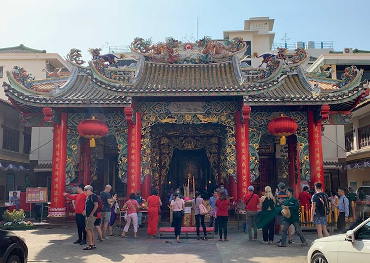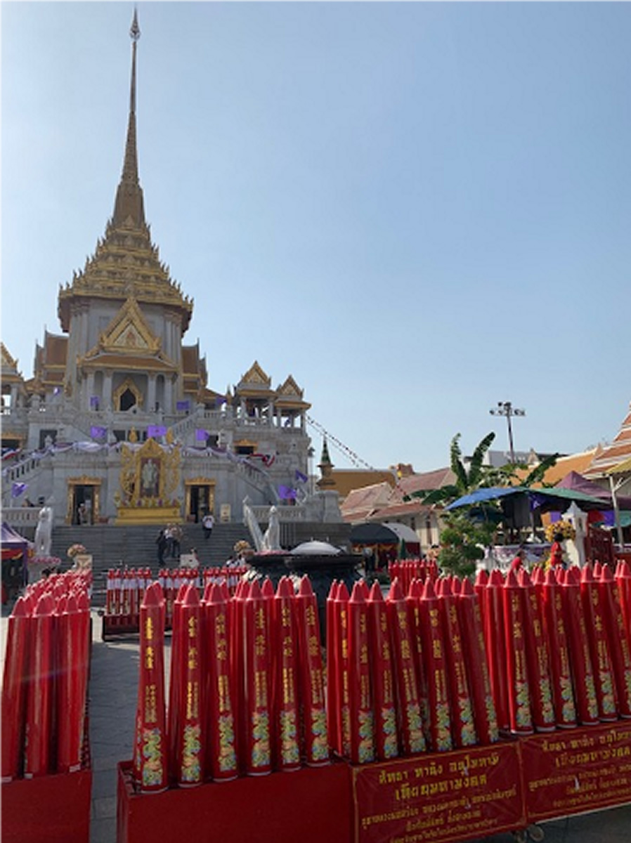 「タンブン」とは、“善行を行う・徳を積む”。こちらの寺院は“お金儲けのご利益”があるそうで、こちらで「タンブン」される人も多くいると聞きます。“春節”に向けて“赤い巨大蝋燭”が用意されておりました。凄いんだろうなぁ、爆竹…。