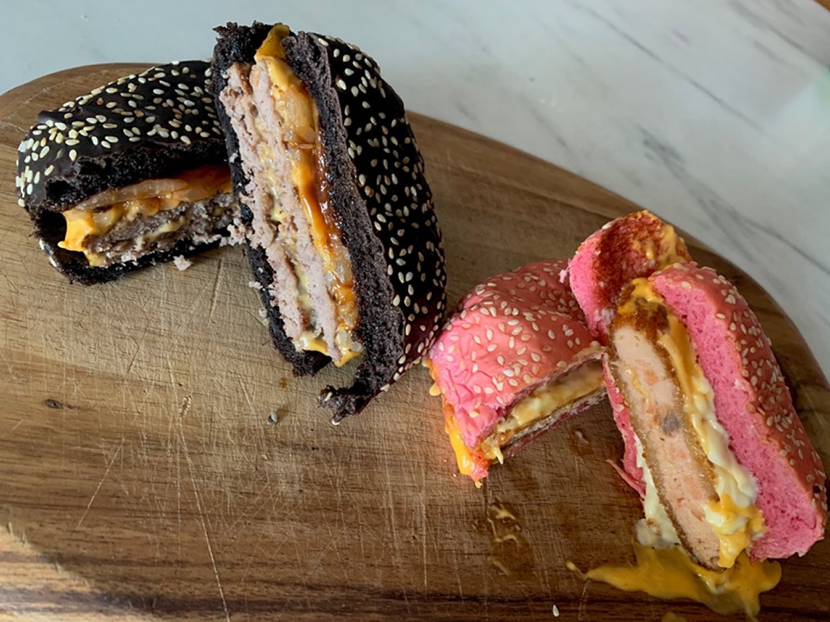 PINK SALMON BURGER:確かにサーモンは炙るとオレンジ色からピンク色へ変化するよね。サーモンカツにチーズ、マヨにマスタードとちょっとピリ辛に仕上がっている。見た目重視でもあるんだろうけど、黒も桃色も美味しく仕上がっていました。