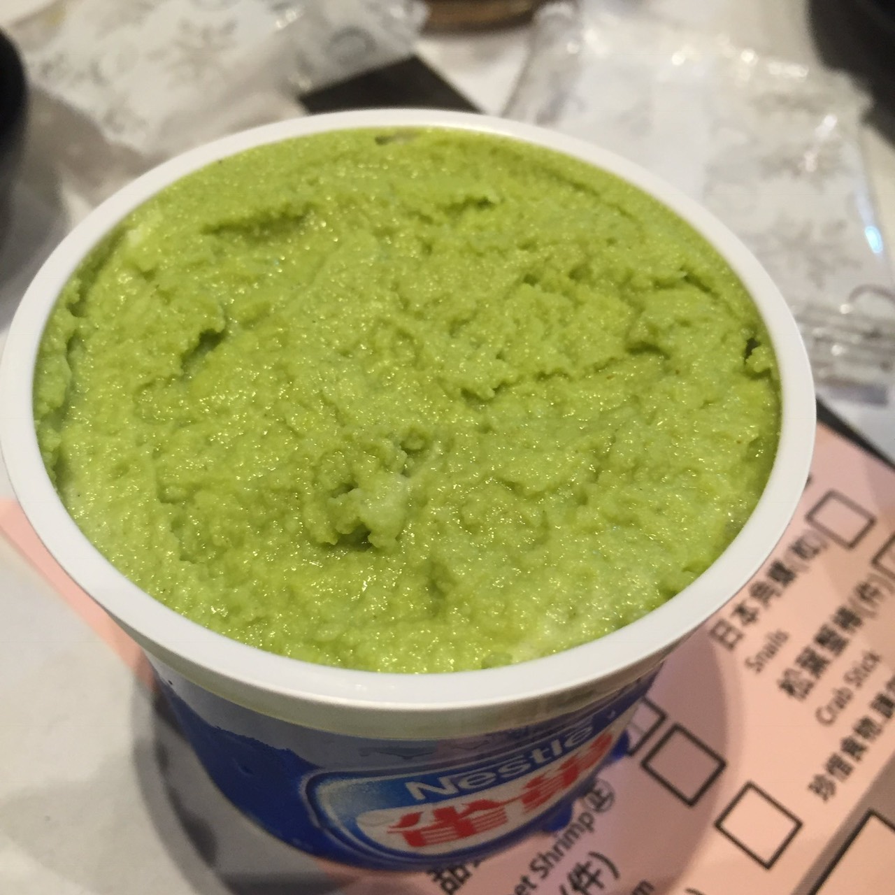 伊関:これヤバくない?! これを抹茶アイスっていって、いろんなスタッフさんにあーんでワサビアイスを食べさせたんだよね。ケンジさんにも食べさせた気がする。ヤバいよ。