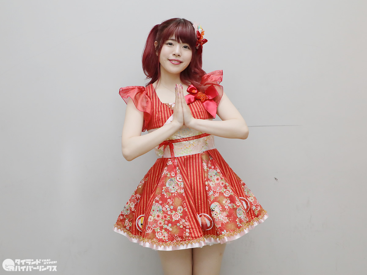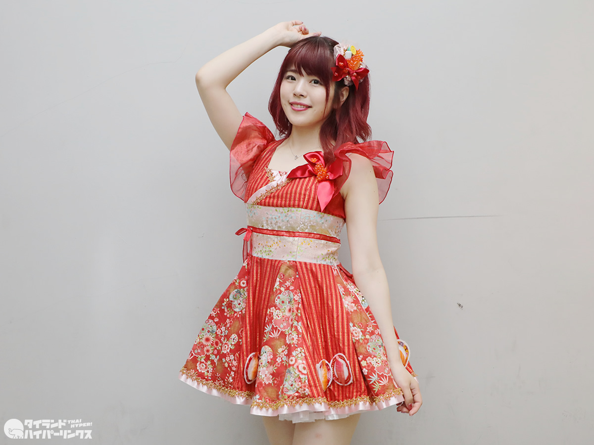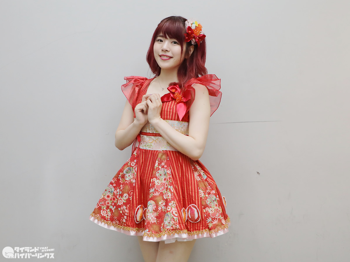 葉月:お寿司の赤い衣装!今回は1時間もステージがあるから、私の衣装の中でも涼しいやつをまず選ぼうと思って(笑)。私が最初のタイ遠征で着た衣装はもこもこのやつだったんです。タイなのにもこもこのやつだったので、それは暑くて無理だなと。何があるかなって考えたときに、この衣装で前写真を撮っていただいた思い出があって、それがお気に入りだったのでもう一回着ることにしました。ダイエットも成功したし、二の腕も出しちゃおっかな、みたいな感じで選びました。