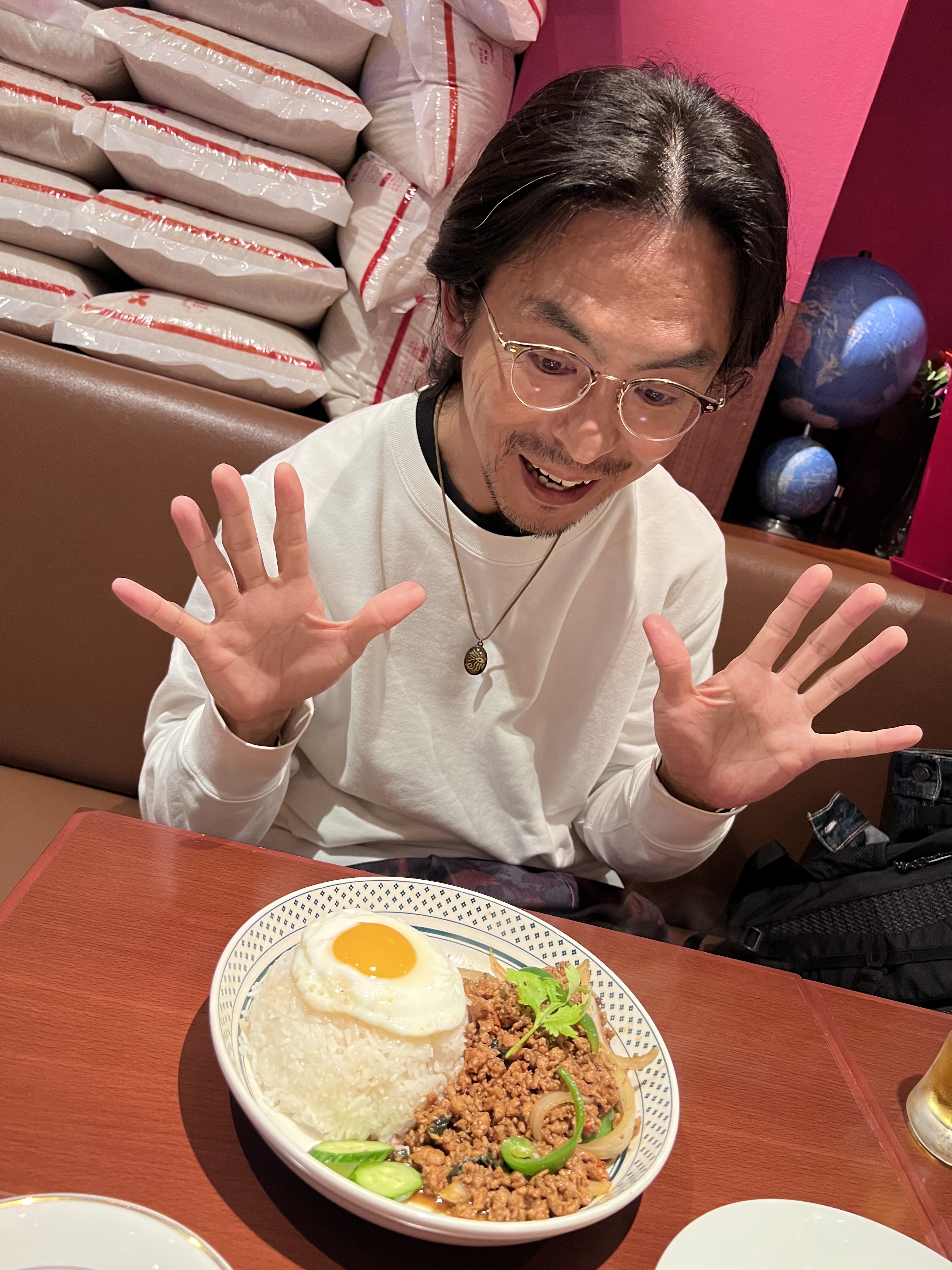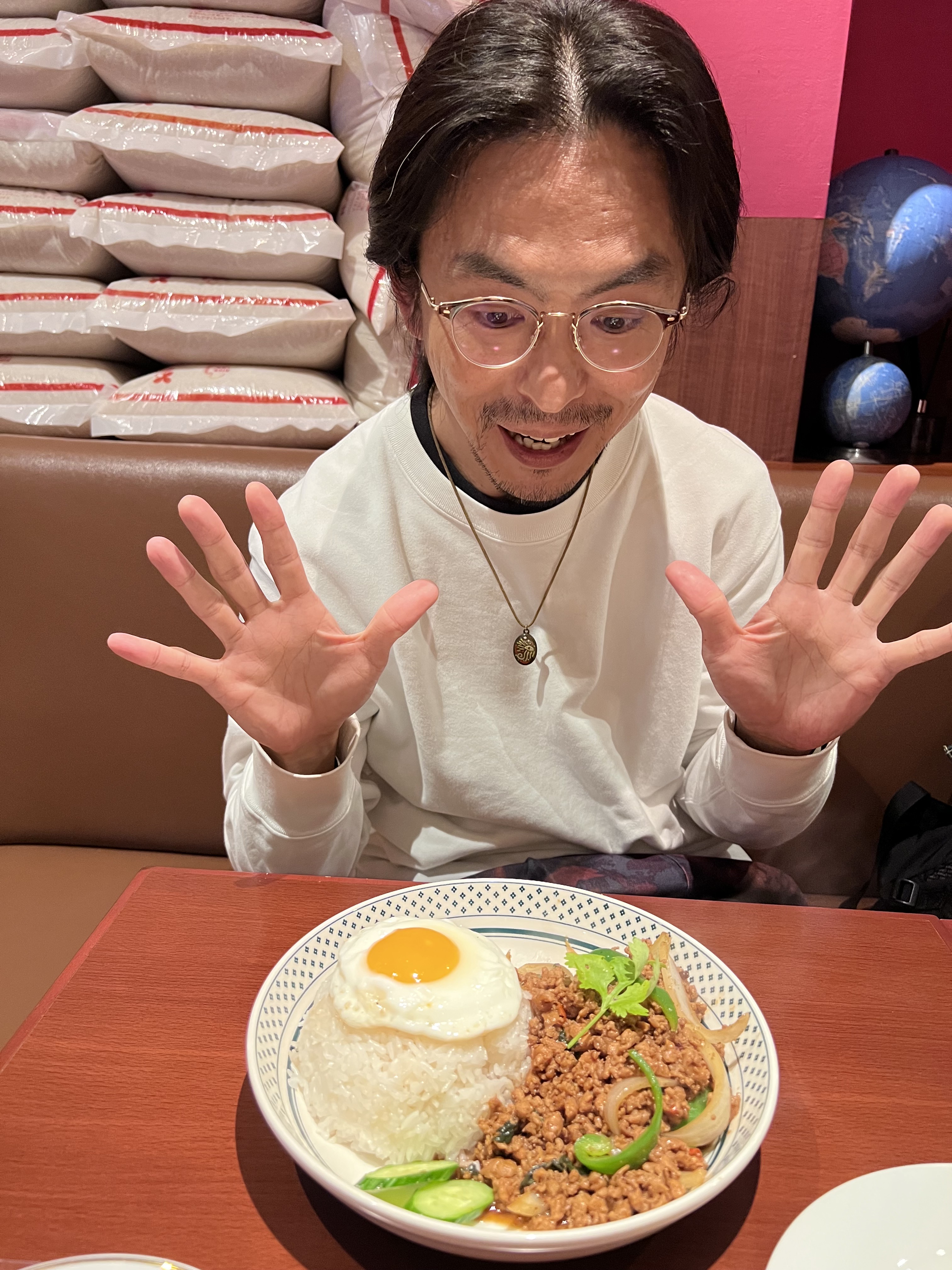 ケンジ:うーんそうですね…。こう、ガパオライス見て「美味しそうすぎて、わー、驚いた」みたいな。両手を広げるポーズをお願いします。