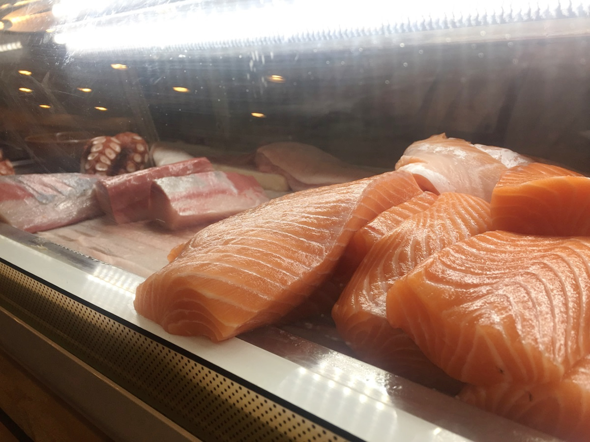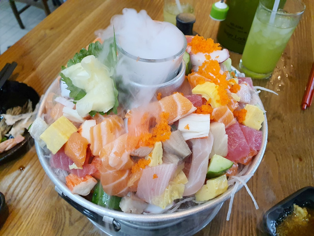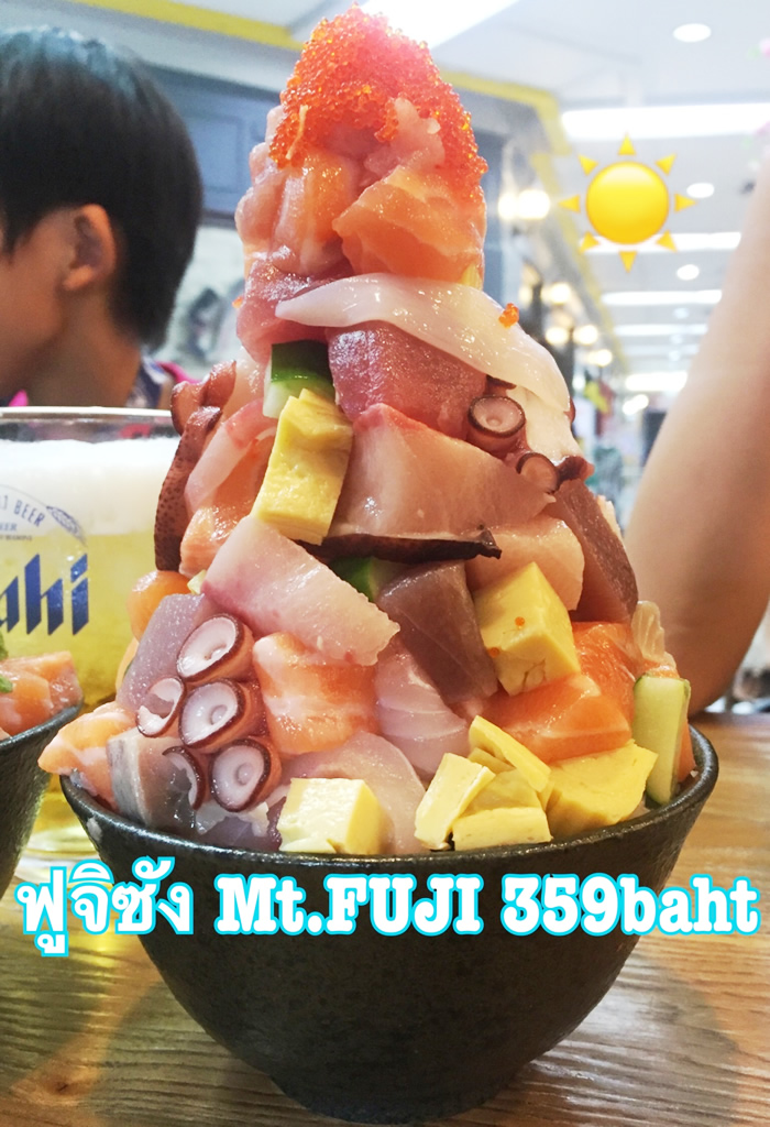 ショーケースには新鮮なサーモンやハマチなんかがドーンと置かれている、「醤油味…(苦笑)」。タイ人の子たちは“タイスキ”の器に大量の切り身が盛られた“刺盛”を頼んでいる人が多かったけど、俺たちは“Mt.Fuji”ってことで…