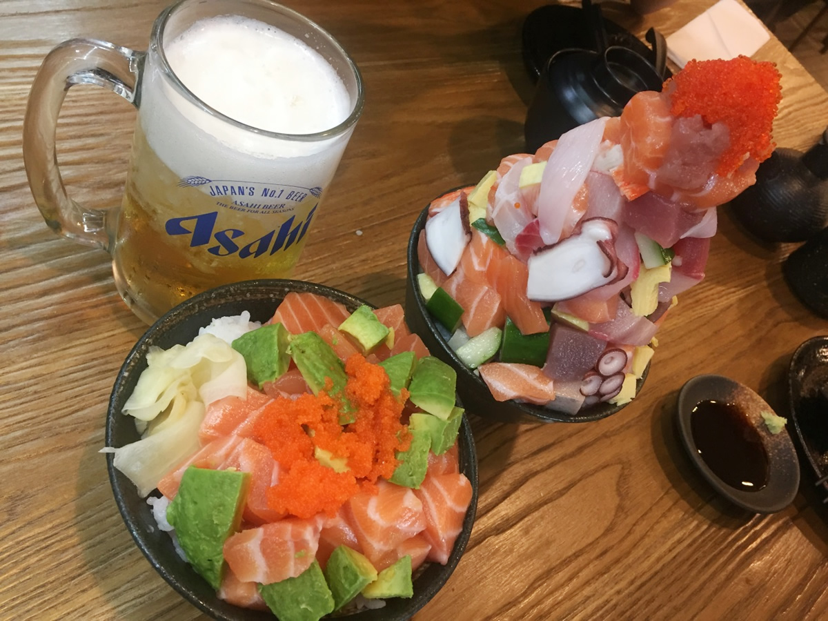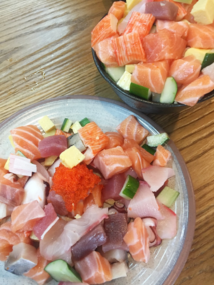“ฟูจิซัง(富士山)”と名付けられた“ちらし丼”。手前の普通盛“サーモン・アボカド丼”と比べても高さが…。