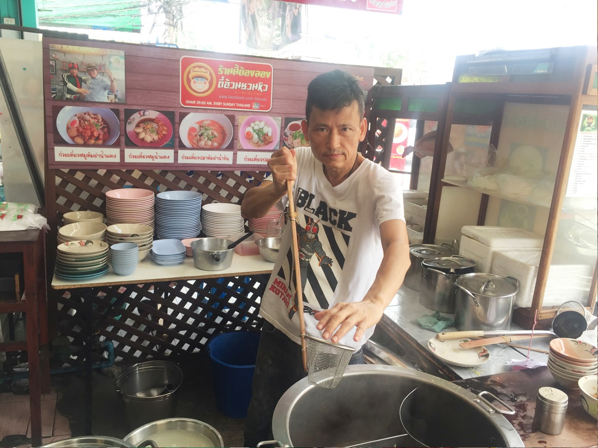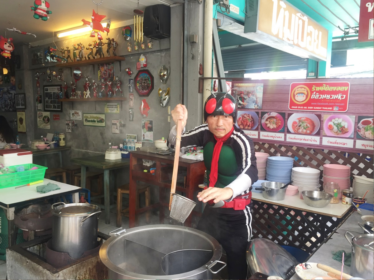 ラーメンはก๋วยเตี๋ยวหมูน้ำแดง(クイッティアオムーナムデーン:チャーシュー麺)がお店の一押し…旨い!! これだけでも、ここまで食べに来る価値有り。店内は“仮面ライダー”の他“ウルトラマン”のフィギアや懐かしのポスターなんかで装飾されている。だからこそ、会いたかったぜ…仕方が無い、今日は仮面ライダーに会えないのか…とあきらめて帰ろうとしたその時、「ちょっと待ってろ、お店を一人で回しているから忙しくて…変身して来てやる」と“ブラック”Tオッチャンが…。