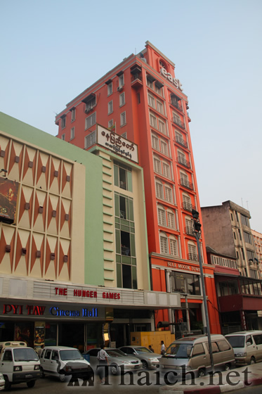 ホテル予約サイトagoda.comで予約したのはミャンマー・ヤンゴンの中心スーレーパゴダ通りにあるイーストホテルです。北側にはサクラタワー、道路を挟んで反対側にはトレイダースホテルがあります。隣は映画館NAY PYI TAW Cinema Hall。