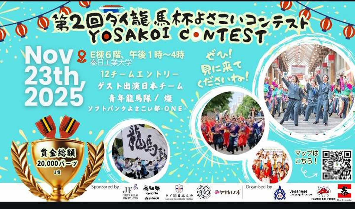 日タイの文化交流を深める「第2回タイ龍馬杯よさこいコンテスト」および「タイ日よさこいフェスティバル」が、2025年11月23日(日)に泰日工業大学で開催されます。今年は、高知とバンコクで同日開催される『第37回龍馬World東アジア大会』との合同企画となり、日本からのゲスト参加も予定されています。