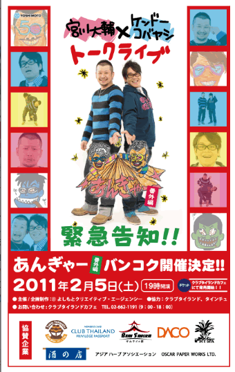 人気芸人の宮川大輔さんとケンドーコバヤシさんによるトークライブが2011年2月5日2月6日、バンコク・インペリアルクインズパークホテルにて行われます。