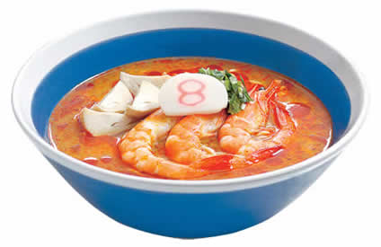 これは日本からタイに出店し、タイのラーメン界では圧倒的店舗数と人気を誇る8番ラーメンのトムヤムクンラーメン。タイの定番スープであるトムヤムクンがラーメンになったもので、タイ人人気ナンバーワンだとか。一時期日本の8番ラーメンでも食べることが出来ました。