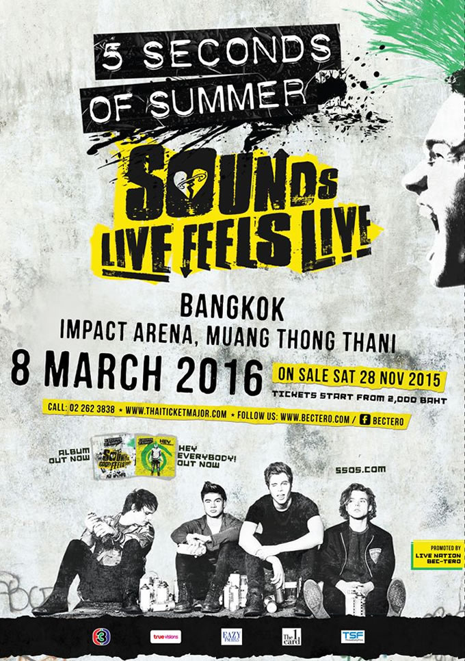 オーストラリアの人気バンド 5 Seconds of Summer(ファイヴ・セカンズ・オブ・サマー)のタイ・バンコク公演「MAKE IT SOUNDS LIVE FEELS LIVE」が、インパクトアリーナ・ムアントンタニで2016年3月8日に開催されます。