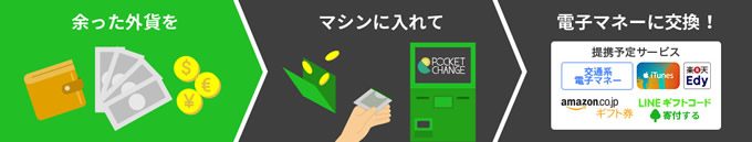 株式会社ポケットチェンジは、海外旅行で外貨に両替し、余って日本に持ち帰った硬貨・紙幣を希望の電子マネーや各種ギフトコード、クーポンなどに両替できる専用キオスク端末を開発。 2016年6月中旬より楽天株式会社 本社社屋に、7月には羽田空港に設置してサービス提供をスタートします。