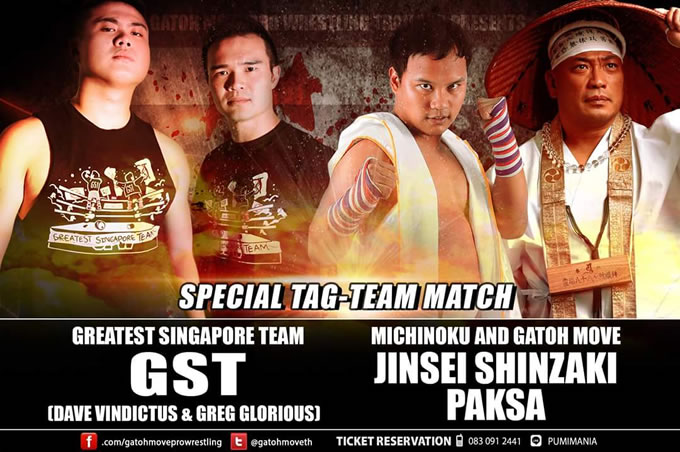 新崎人生(日本・みちのくプロレス)&パクサー(タイ・我闘雲舞) vs 《GST=GREATEST SINGAPORE TEAM(シンガポール)》デイブ・ビンディクタス&グレッグ・グロリアス