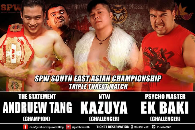 “ザ・ステイトメント”アンドリュー(王者・シンガポールSPW)with GMカール・ヘラ vs E.K.バギー(挑戦者・我闘雲舞タイ) vs カズヤ(挑戦者・新台湾プロレス)