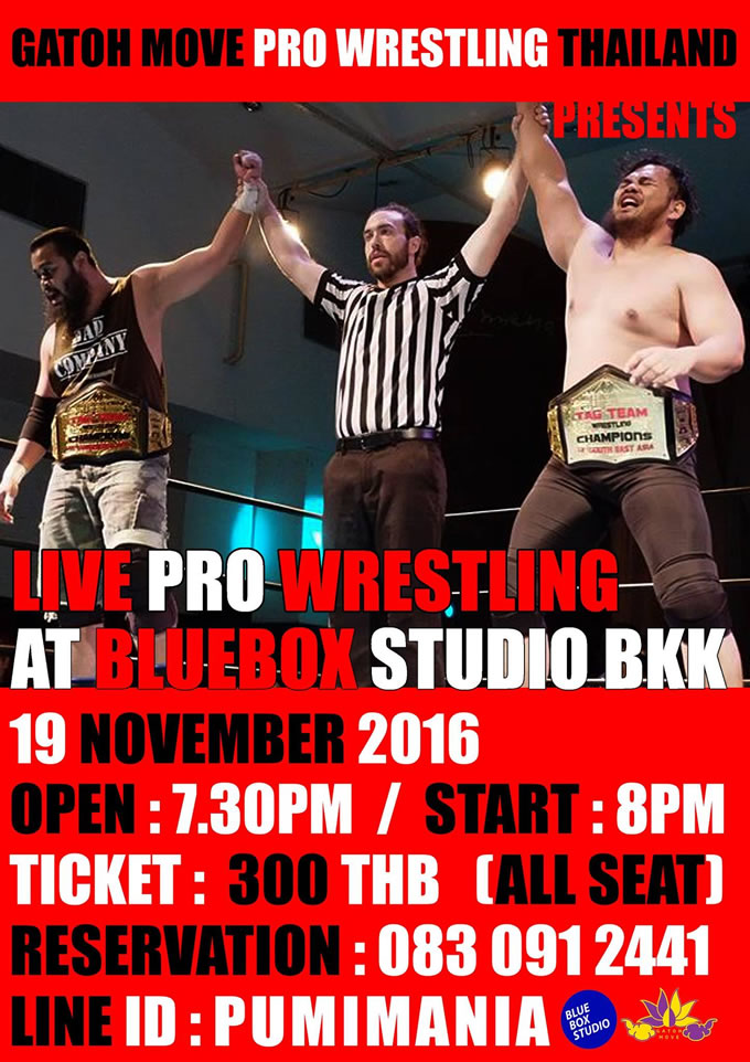 先日旗揚げから4周年を迎え、初のプロレスのリングで記念大会を開催した我闘雲舞タイランドが2016年11月19日、バンコク・BLUEBOX STUDIOで「GATOH MOVE PRO WRESTLING : LIVE AT BLUEBOX STUDIO」を開催します。