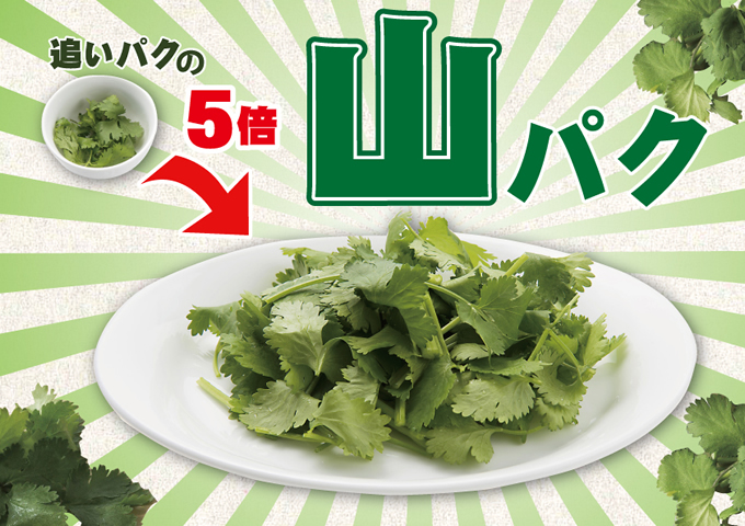 「追いパク」とは、デニーズでは様々な食事にパクチーをトッピングするためのもので、「山パク」にはその5倍の量のパクチーを使っているそうです。