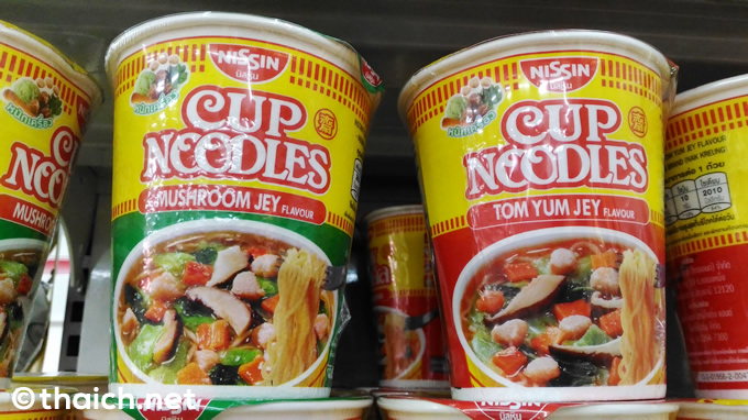 キンジェーの時期は街中が「齋」「เจ」と書かれた黄色い旗やステッカーで溢れ、キンジェー料理が販売されます。なお、今現在でキンジェーまで一ヶ月ありますが、すでにスーパーマーケットやコンビニエンスストアではキンジェー食品が並んでいます。上の写真はキンジェーの日清カップヌードル。
