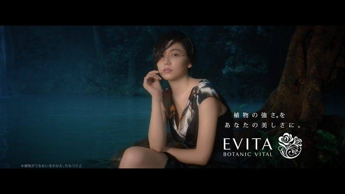 水辺の神秘的な風景の中、頬に手をそっと当て、ぷるんとなめらかな質感の「エビータ ボタニバイタル 艶リフトジェル」を頬にのばし、うるおいに満ちて気持ちよさそうな長澤さん。「そのみなぎる強さ※1を、エイジングケア※2に。」「ボタニバイタル処方。」「誕生『エビータ ボタニバイタル』」とナレーションが入ります。大自然の風景と一体化したような心地よさを見せ、「植物の美しさをあなたの美しさに」というスローガンで締めくくります。
