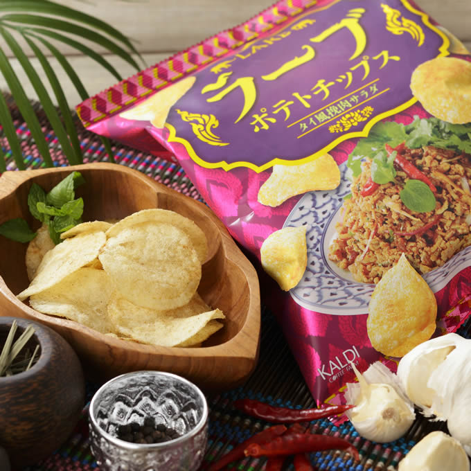 挽肉とハーブのサラダ“ラーブ”の味わいをイメージしたポテトチップス。スパイシーな中にもハーブの香りがクセになる味わいです。