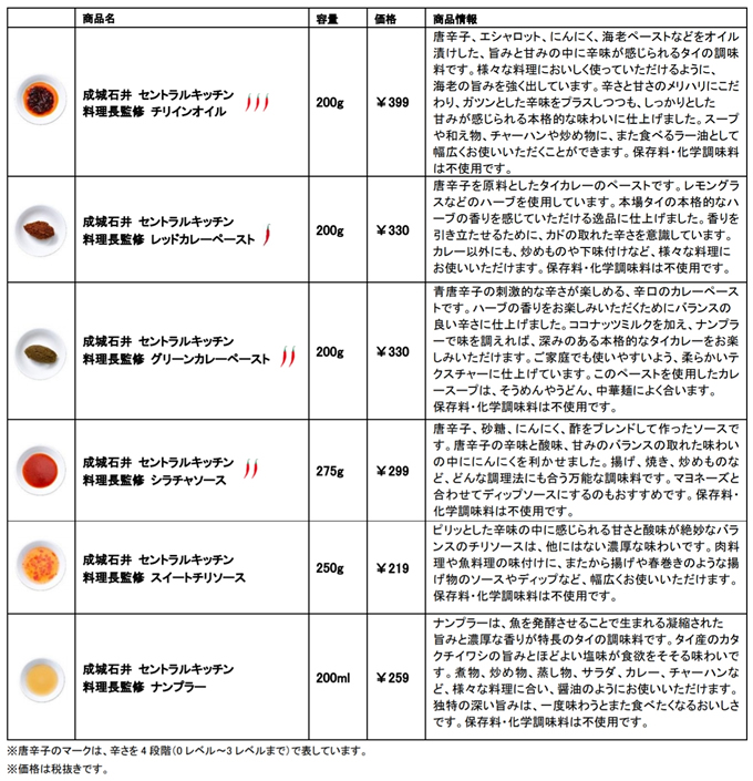 2017年6月、タイでの買いつけの際、成城石井におけるエスニック惣菜のパイオニアであるセントラルキッチンのエスニックの料理長、勝本がバイヤーに同行。数々のヒット商品を世に送り出してきた勝本のノウハウを活かし、現地のメーカーと共同で、エスニック調味料の開発に着手しました。それ以降、1年間にわたって試行錯誤を重ねて完成したこだわりのエスニック調味料がついに新登場します。普段はエスニックフードに馴染みがない方でも、手軽にチャレンジしやすい6種類のラインナップをご用意。
