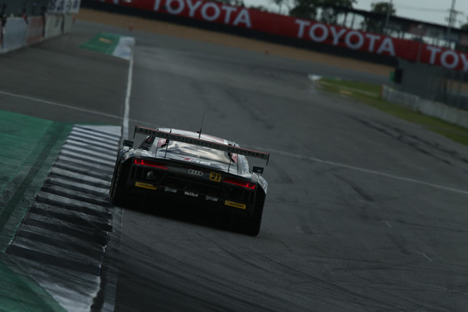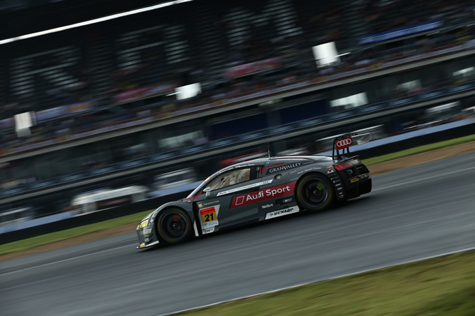 予選は直前に降った雨がコース各所に残った状態でのスタートとなりました。ウェットコンディションを得意とするダンロップタイヤを装着したAudi Team Hitotsuyamaの富田 竜一郎選手がまずQ1を担当します。トップと僅差の好調な走りで、見事に2位のタイムでQ1を突破。Q2はリチャード ライアン選手がアタックに出ました。路面が乾きはじめ、ライバルチームがタイムをあげてくる状況下でも力強くラップを刻み、4位のタイムでフィニッシュしました。予選後、上位2台が車検で不合格となり予選タイムを抹消されたため、決勝レースは2位、フロントローからのスタートとなりました。