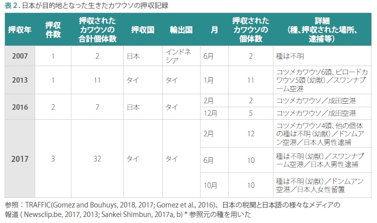 2000年から2017年にかけて起きた、日本が関係する東南アジアでの押収事例などを調べたところ、少なくとも7件で52頭のカワウソが日本を密輸の目的地とし、そのうち17頭はコツメカワウソでした。