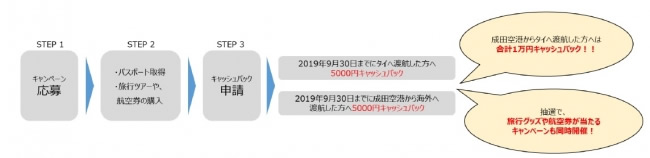 期間中にパスポートを取得し、タイへ渡航した方、成田空港発の国際線を利用した方それぞれ先着200名様に5000円をキャッシュバックします。さらに、抽選でタイ行き航空券や豪華グッズがあたるキャンペーンも同時開催します。