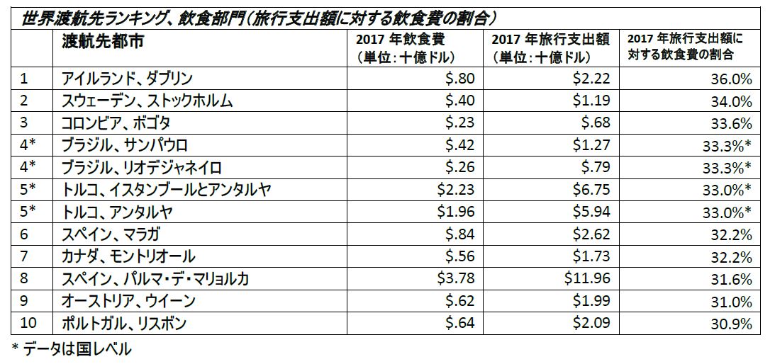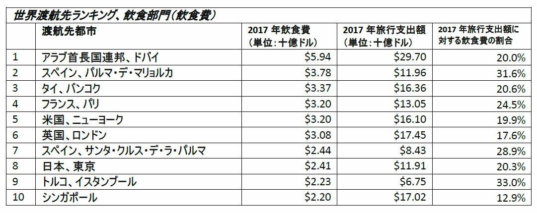ドバイ、パルマ・デ・マリョルカ、バンコク、パリといった4都市における渡航者の飲食費は、他の都市を上回っていました。上位10都市にはシンガポールやロンドンも入りましたが、旅行支出額全体に対して飲食に費やす割合は低く、それぞれ12.9%と17.6%に止まりました。東京は8位にランクインし、飲食費の割合は20.3%となりました。