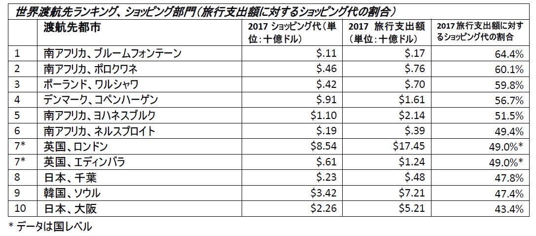 「世界渡航先ランキング、レジャー部門」によると、衣服、お土産、その他の品々などショッピングの消費額では、ドバイとロンドンがそれぞれ1位、2位となりました。日本の都市を見てみると、旅行支出額全体に対するショッピング代にかける割合は、千葉、大阪、東京がそれぞれ47.8%、43.4%、43.1%となり、3都市の旅行中ではショッピング代に多く費されていることがわかります。