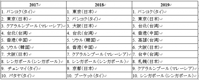 1位のバンコクは前年の2位からランクアップ。2年ぶりのトップ返り咲きです。プーケットは、昨年の海難事故の影響でしょうか、10位圏外となりました。