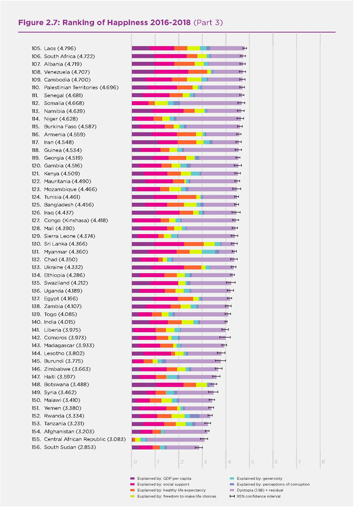 最下位となる156位は世界一新しい国である南スーダンでした。北朝鮮が最下位ではないかと予想していましたが、北朝鮮国民に対して調査が出来なかったのでしょう。