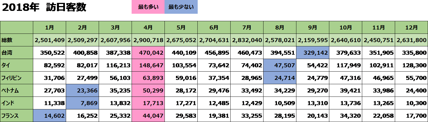 まずはこちらが2018年の訪日客数。調査を行なった台湾、タイ、フィリピン、ベトナム、インド、フランス全ての国で、もっとも訪日客数が多いのが4月になっています。タイからは2018年4月には、15万人近くの人が訪日。