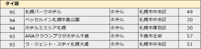 タイ語でのクチコミ高評価の北海道の宿トップ5は「札幌パークホテル」「ベッセルイン札幌中島公園」「ホテルエミシア札幌」「ANAクラウンプラザホテル千歳」「ラ・ジェント・ステイ札幌大通」です。