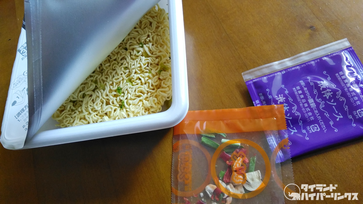 作り方はカップ焼きそばと同じで簡単。かやくを入れてお湯を注いで、3分待って、お湯を捨てて、液体ソースをかけて混ぜるだけ。