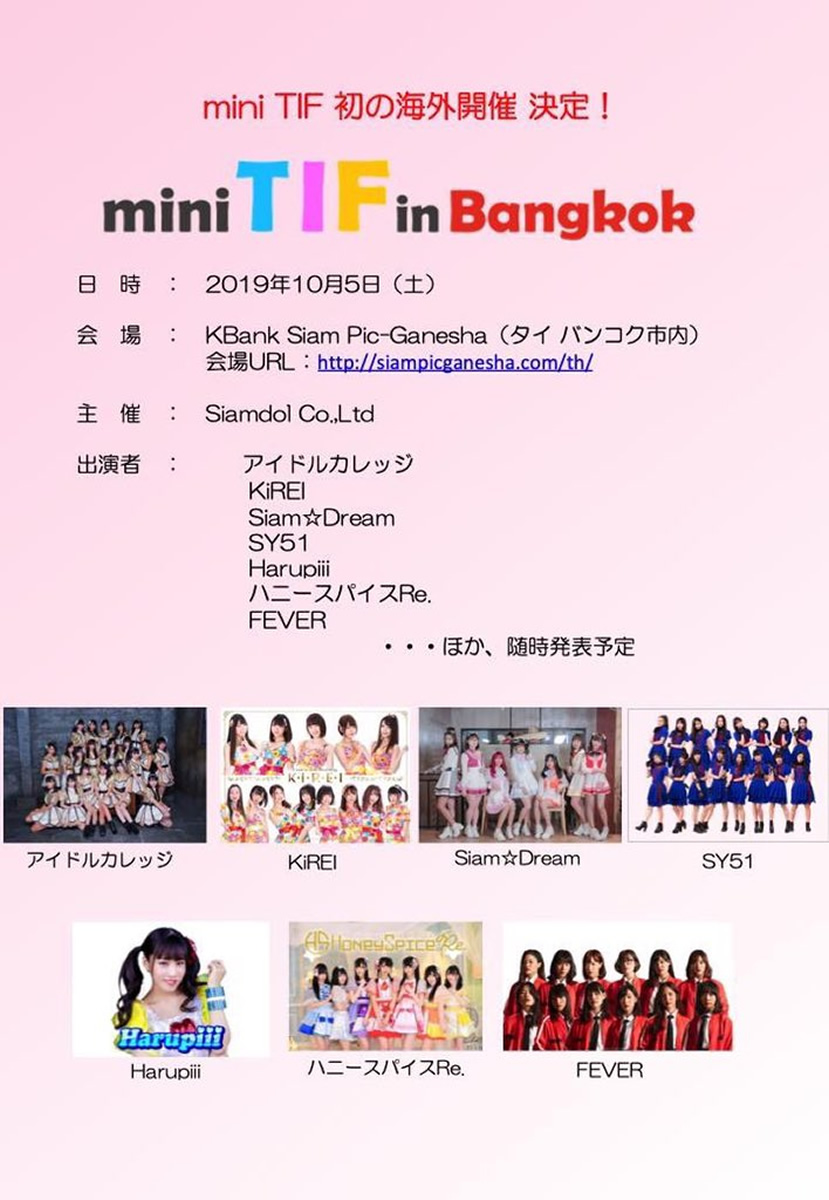 タイでアイドルライブを手掛けるサイアムドルは2019年8月3日、タイ・バンコクで「mini TIF in Bangkok」を2019年10月5日に開催すると発表しました。「mini TIF」が海外で開催されるのはこれが初めてとなります。