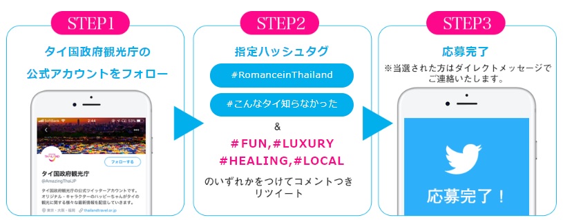 タイ国政府観光庁の公式Twitterアカウント(@AmazingThaiJP)をフォローして、指定のハッシュタグと「#FUN #LUXURY #HEALING #LOCAL」のいずれかと 「#こんなタイ知らなかった #RomanceinThailand」をつけて、コメントつきリツイートをしていただいた方の中から、抽選で1組2名様に「クラビ 5日間のペア旅行」をプレゼント致します。
