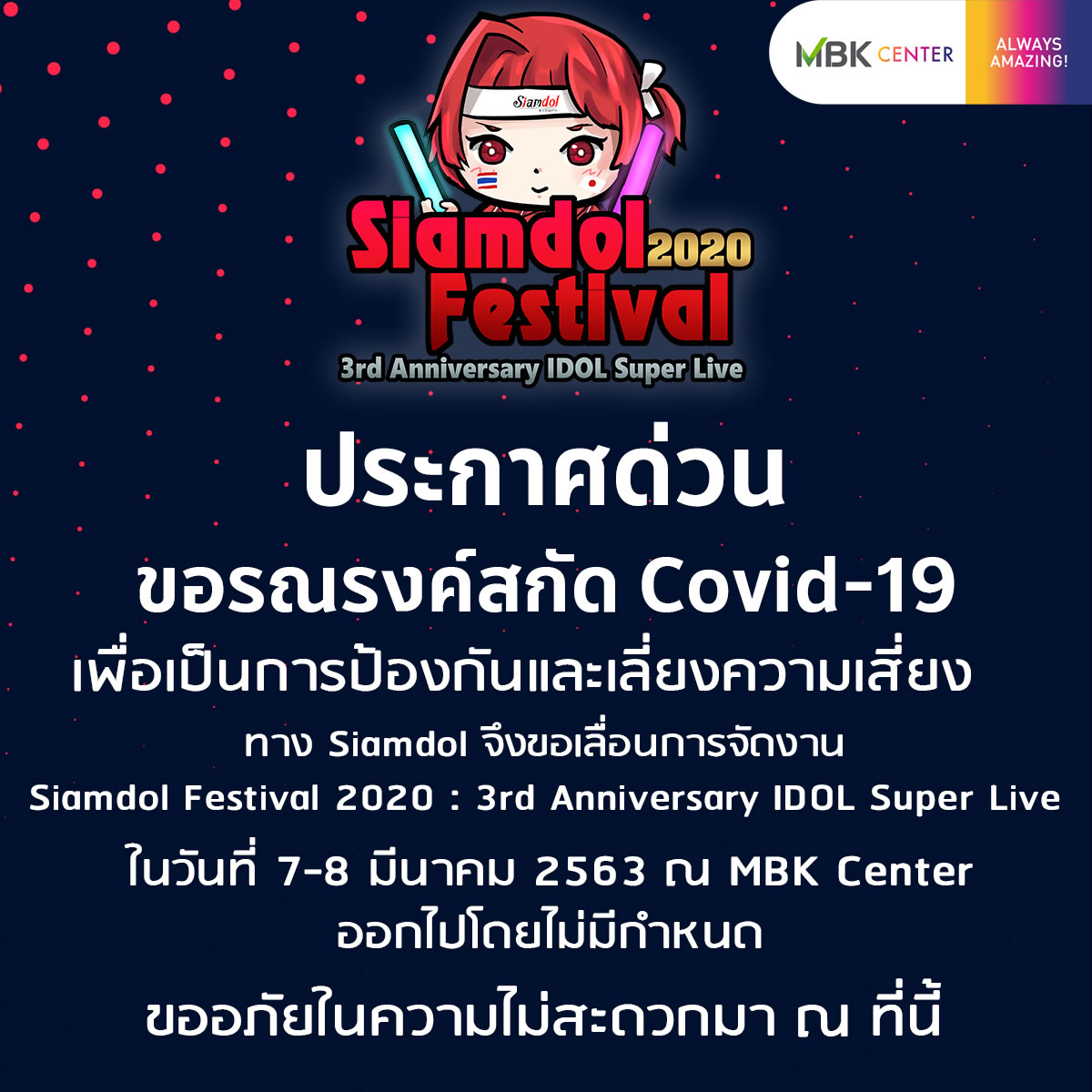2020年2月28日にタイのアイドルイベントを手掛けるSiamdolは、3月7日・8日に予定されていたタイや日本などアジアの国々のアイドルグループによるライブイベント「Siamdol Festival 2020 : 3rd Anniversary IDOL Super Live」を無期限で延期すると発表されていました。READY TO KISS、W.(ダブルヴィー)といった一部の日本のアイドルグループは数日前に不参加を発表していました、イベント全体が延期となりました。同じくSiamdolが主催した、「//ネコプラ//」と「ゑんら」のワンマンライブも中止が発表されました。