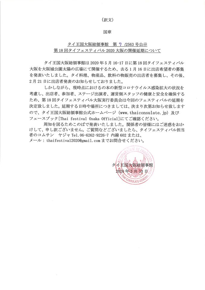 しかしながら、現時点におけるの本の新型コロナウイルス感染拡大の状況を考慮し、出店者、参加者、ステージ出演者、運営側スタッフの健康と安全を確保するため、第18回タイフェスティバル大阪実行委員会は今回のフェスティバルの延期を決定致しました。延期する日時や場所につきましては、決まり次第お知らせ致しますので、タイ王国大阪総領事館公式ホームページ(www.thaiconsulate.jp)及び フェースブック[Thai festival Osaka Official]にてご確認ください。